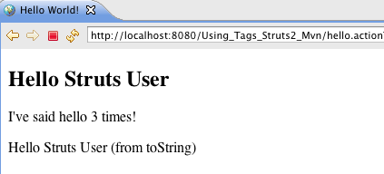 To include the value of the helloCount attribute in the HelloWorld.jsp we can use the Struts 2 property tag. Add the following to HelloWorld.jsp after the h2 tag.