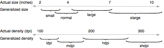 Each generalized size and density spans a range of actual screen sizes and densities. For example, two devices that both report a screen size of normal might have actual screen sizes and aspect ratios that are slightly different when measured by hand. Similarly, two devices that report a screen density of hdpi might have real pixel densities that are slightly different. Android makes these differences abstract to applications, so you can provide UI designed for the generalized sizes and densities and let the system handle any final adjustments as necessary. Figure 1 illustrates how different sizes and densities are roughly categorized into the different size and density groups.