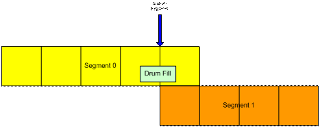 The end-of-segment marker can also be used to allow for completion of a musical figure beyond the end of measure that marks the start of the next segment. For example, the content author might create a 4-bar segment with a drum fill that ends on beat 1 of the 5th bar, a bar beyond the natural end of the segment. By placing an end-of-segment marker at the end of the 4th bar, the next segment will be triggered, but the drum fill will continue in parallel with the next segment providing musical continuity.