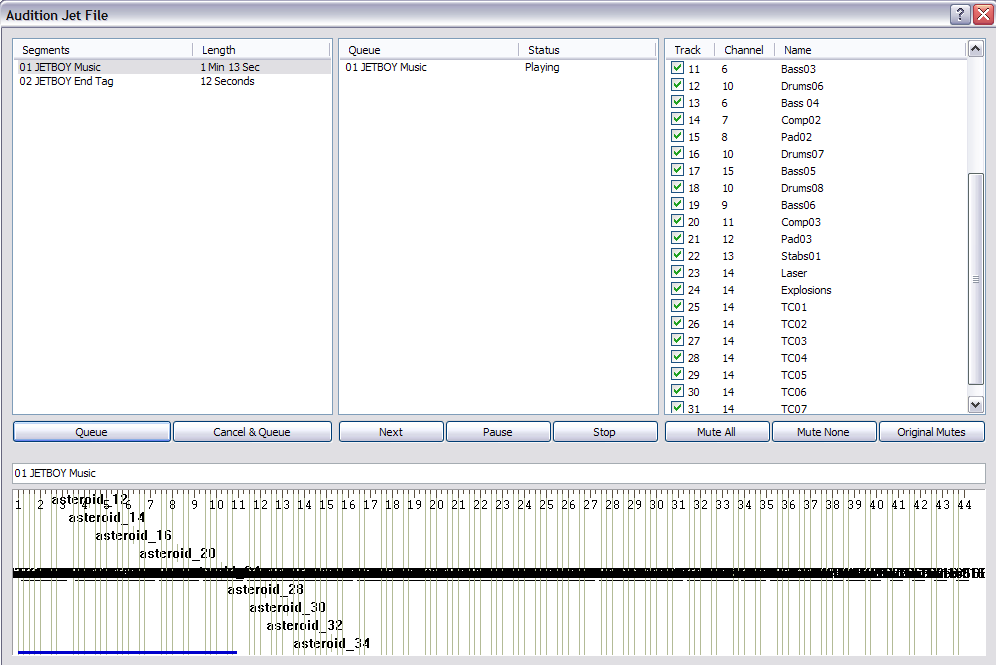 There are four main sections to the audition window. The left most section displays the available segments and their length in seconds. The middle section displays a running list of what segments are queued for playback and what their playback status is. The far right section displays the mute flags for the currently playing segment. The timeline section at the bottom is the same as in the main window. It displays the currently playing segment as well as a visual display of any event triggers associated with that segment.