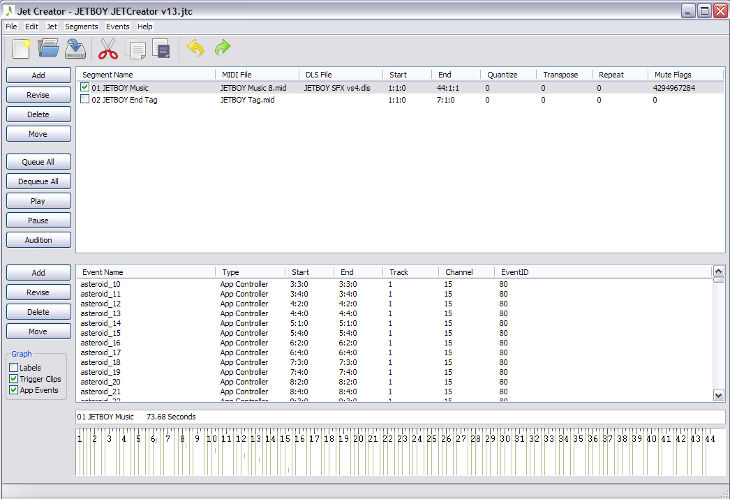 The main window of the JET Creator application looks like the picture below. There are three main sections from top to bottom: segment view, event view, and timeline.