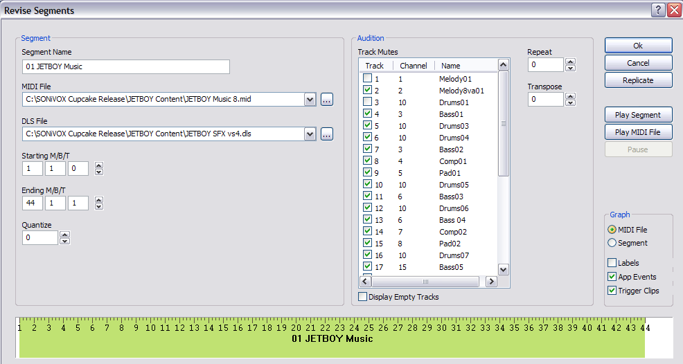 If you’re trying to conserve memory, compose as few MIDI files as possible, and create several segments from that MIDI file. For example a 12 bar MIDI file with three sections of 4 bars, A, B, C, can create a much longer song. Simply create multiple segments that reference the one MIDI file, then order them however you like. For example, A, A, B, A, C, A, B, A, A would create a 36 bar song. Use JET to add repeats, transpose segments, and interactively mute and unmute tracks to keep it even more interesting.