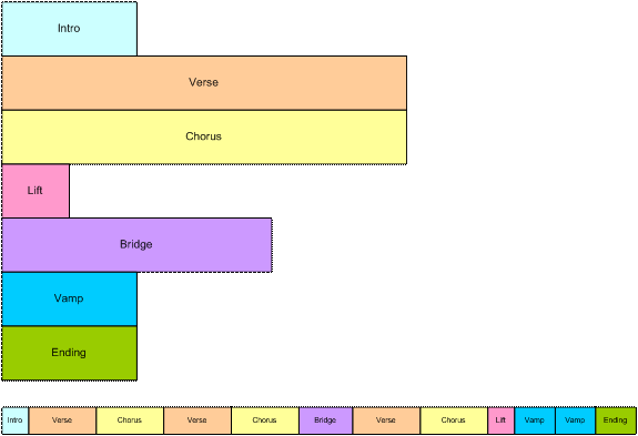 The bottom part of the diagram shows how the musical segments can be recombined to create a linear music piece. In this example, the bridge might end with a half-step key modulation and the remaining segments could be transposed up a half-step to match.