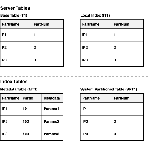 The structures shown in these tables (table T1, index IT1 and the system partitioned table SPT1) have the same number of partitions, in a one-to-one relationship. The metadata table MT1 has as many rows as the number of partitions in these tables.