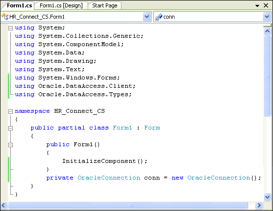 Visual C#: Add the class variable conn to the Form1 class right after the public Form1() block with this code.