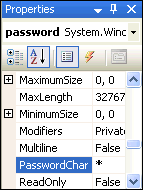 Select the text box next to the Password label. In the Properties Window, scroll to the PasswordChar property and set it to an asterisk (*).