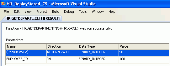 In Server Explorer, open and expand the HR.ORCL connection. Expand Functions. Right-click GETDEPARTMENTNO and select Run.