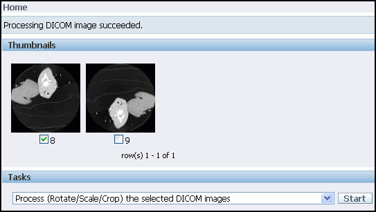On the DICOM Image Archive Home page, select the thumbnail image of the lungs, which has been made anonymous. Then, select Process (Rotate/Scale/Crop) the selected DICOM images from the Tasks list. And, click Start to display the Process DICOM Images page shown in Figure 6-13.
