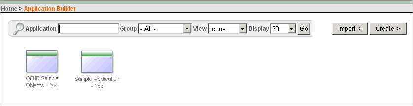 For consistency, this document uses the primary navigation path (or drill-down approach) when explaining navigation.The Application Builder home page displays all installed applications.