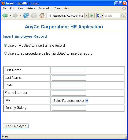 You can now run the application and use the radio buttons on the insert page to choose how you want to insert the new employee record. In a browser, the page will appear as shown in Figure 6-2.