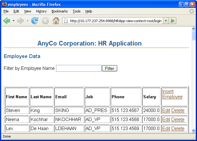 To insert an employee, click Insert Employee on the employees.jsp page shown in Figure 5-6.