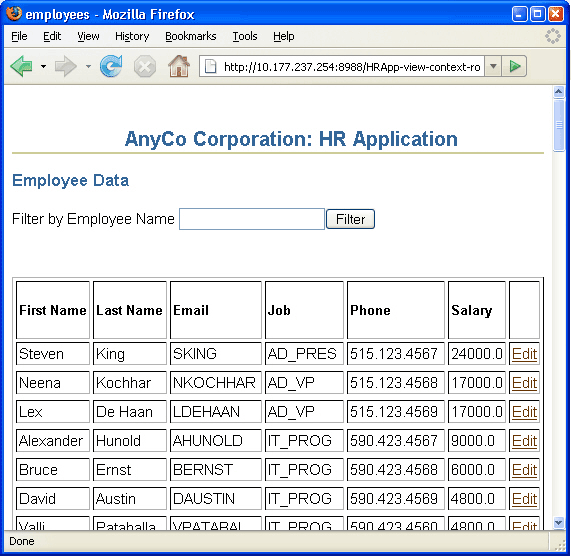 On the main application page, in every row of employee data, include a link that allows a user to edit the data for that employee. The links take the user to the edit.jsp file with the data for that employee displayed, ready for editing.