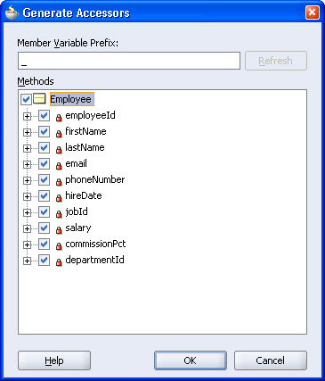 Right-click on the Source Editor page and select Generate Accessors from the shortcut menu. In the Generate Accessors dialog box, select the top-level Employee node. A check mark is displayed for that node and for all the fields. Click OK. Figure 5-1 shows the Generate Accessors dialog box with all the fields selected.