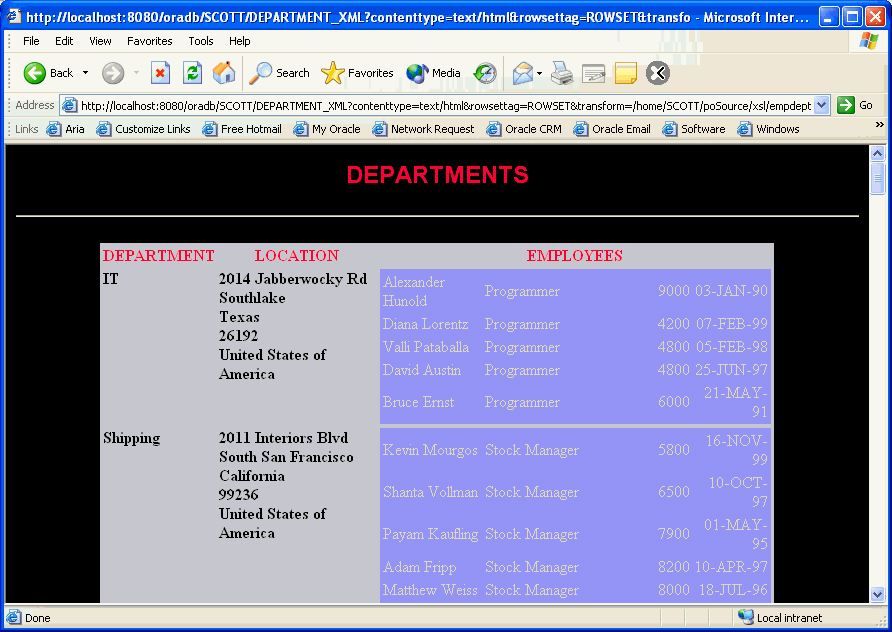 Figure 3-8 shows the departments table displayed as an HTML document. You need no code to achieve this, you only need an XMLType view, based on SQL/XML functions, an industry-standard XSL style sheet, and DBUri servlet.
