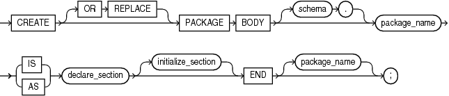The CREATE PACKAGE BODY statement creates or replaces the body of a stored package, which is an encapsulated collection of related procedures, stored functions, and other program objects stored as a unit in the database. The package body defines these objects. The package specification, defined in an earlier CREATE PACKAGE statement, declares these objects.