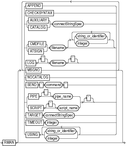Oracle Database Backup and Recovery User's Guide to learn how to start RMAN from the command lineYou must issue the RMAN command and any options at the operating system command line rather than at the RMAN prompt.