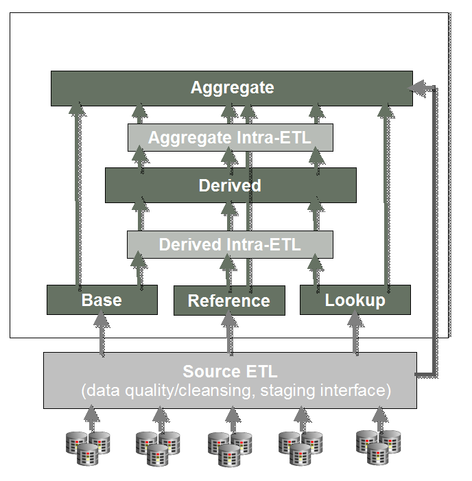 Derived entities contain information drawn from one or more base entities, and can contain denormalized and/or transposed data. Granularity is partially aggregated, typically at day level, but in some cases at quarter hour level or partially aggregated transactional data from the base entities.