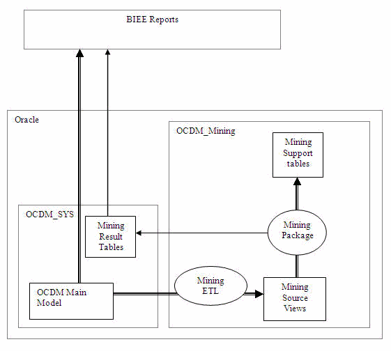 The Oracle Communications Data Model mining consists of two schemas: ocdm_mining and ocdm_sys. Figure 10-1 shows how these schemas function in Oracle Communications Data Model mining.
