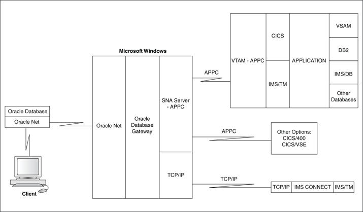 The Oracle Database Gateway for APPC (the "gateway") enables users to initiate transaction program execution on remote online transaction processors (OLTPs.) The Oracle Database Gateway for APPC can establish connection with OLTP using the SNA communication protocol. The gateway can also use TCP/IP for IMS Connect to establish communication with the OLTP through TCP/IP. The gateway provides Oracle applications with seamless access to IBM mainframe data and services through Remote Procedural Call (RPC) processing. The gateway can access any application capable of using the CPI-C API either directly or through a TP monitor such as CICS.