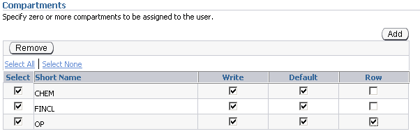 The administrator specifies the list of compartments that a user can place in their session label. Write access must be explicitly given for each compartment. A user cannot directly insert, update, or delete a row that contains a compartment that she does not have authorization to write.