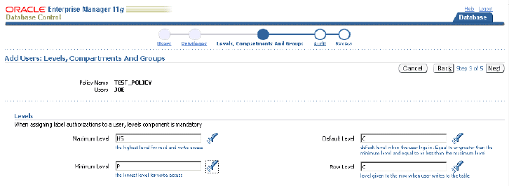 For example, in Oracle Enterprise Manager, the administrator might set the following level authorizations for user Joe: