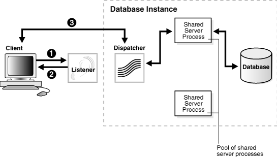 The shared server architecture uses a dispatcher process to direct client connections to a common request queue. An idle shared server process from a shared pool of server processes picks up a request from the common queue. This approach enables a small pool of server processes to serve a large number of clients. A significant advantage of the shared server model over the dedicated server model is reduced system resources, enabling support of an increased number of users.