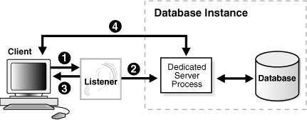 In order for remote clients to connect to dedicated servers, the listener and the database instance must be running on the same computer.Figure 2-7 shows the listener passing a client connection request to a dedicated server process.
