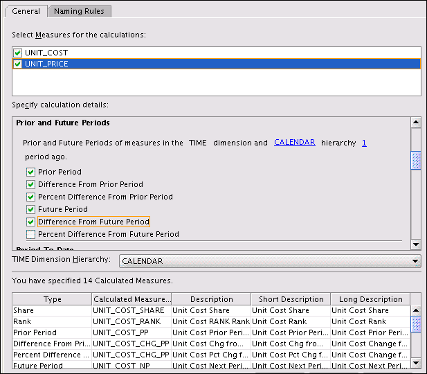 The calculated measure generator quickly generates the standard calculated measures for one or more measures of a cube, including rank, share, prior and future periods, period-to-date, parallel period, moving aggregates, and cumulative aggregates. The generator uses naming rules for formulating the names and descriptions. You can customize these rules on the Naming Rules tab.