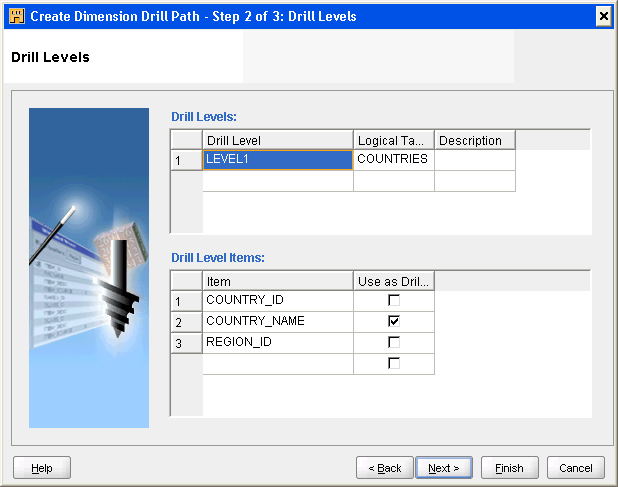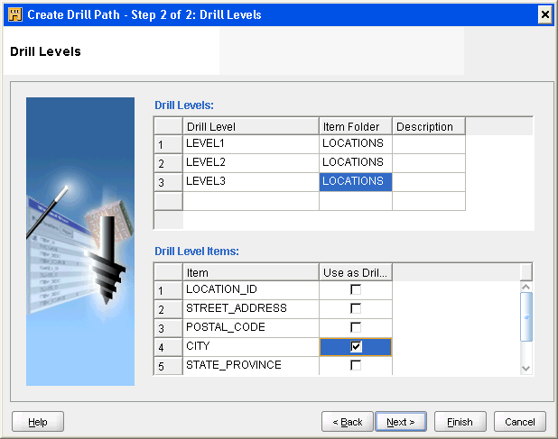 Drill Paths on Item Folders/Logical Tables for the levels: Select this option if you want the Perform Derivation Wizard to create Drill Paths on Item Folders being created for each dimension level. This option applies only if item folders are created for each level.
