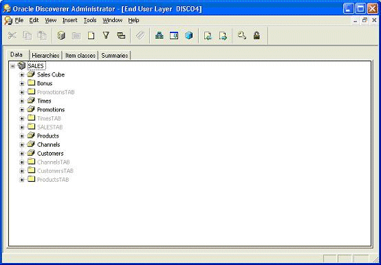 After the Oracle Discoverer module is created, you can locate it under the Oracle Discoverer node on the Projects Navigator. Expand the module to see that Oracle Warehouse Builder provides a representation for the different objects types that comprise the Discoverer EUL. You can define the following types of Discoverer EUL objects:
