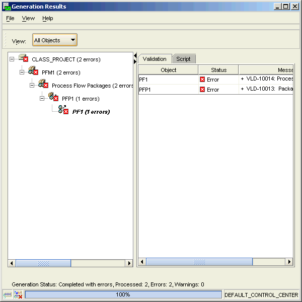 In the validation results, expand the node displaying the object name and then the Validation node. The validation errors, if any are displayed. Double-click a validation message to display the detailed error message in a message editor window.