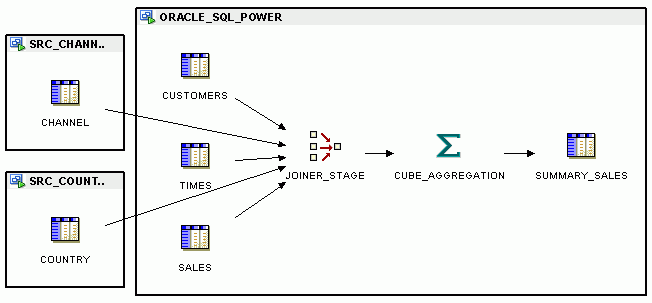 In this example, the tables CHANNEL, CUSTOMERS, COUNTRY, TIMES, and SALES are mapped to the Input groups of the Joiner operator. The Output group of the Joiner operator is mapped to the Aggregator operator. The output of the Aggregator operator is mapped to the target table SUMMARY_SALES.