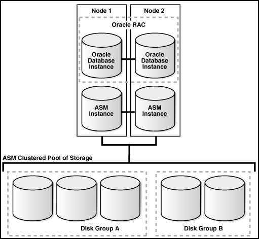 Oracle ASM groups the disks in your storage system into one or more disk groups. You manage a small set of disk groups and Oracle ASM automates the placement of the database files within those disk groups. Oracle Cluster Registry (OCR) and voting disks can also be placed on Oracle ASM diskgroups. When using Oracle Real Application Clusters (Oracle RAC), each instance must have access to the data files and recovery files for the Oracle RAC database. Using Oracle Automatic Storage Management (Oracle ASM) is an easy way to satisfy this requirement.
