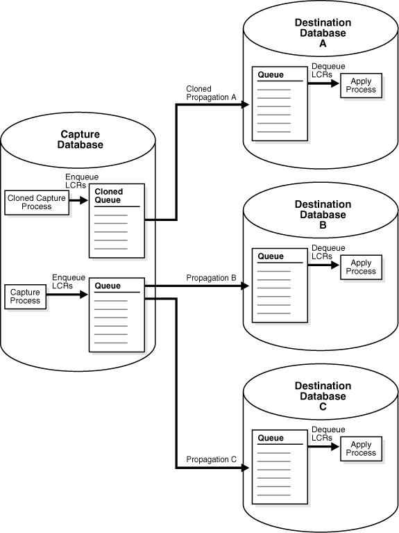 Changes captured by a single capture process are sent to multiple remote destinations using propagations and are applied by apply processes at the remote destinations.