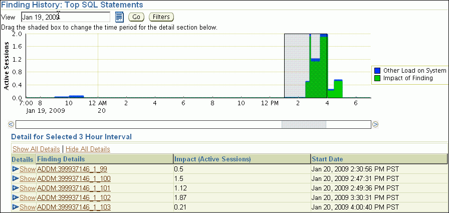 To view details about a finding, under Detail for Selected 3 Hour Interval, click the link in the Finding Details column to display the Performance Finding Details page for the corresponding ADDM finding.