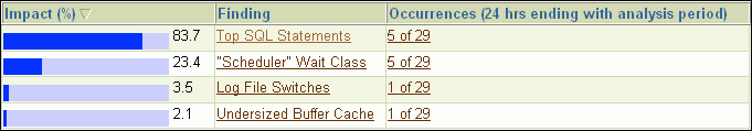 Each problem finding is quantified with an estimate of the portion of DB time that resulted from the performance problem.
