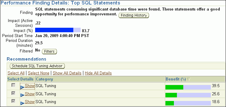 In the following example, three recommendations are shown. The first is estimated to have a maximum benefit of up to 39.5% of DB time in the analysis period. The second recommendation is estimated to have a maximum benefit of up to 25.6% of DB time, while the third has a maximum of 18.6%.