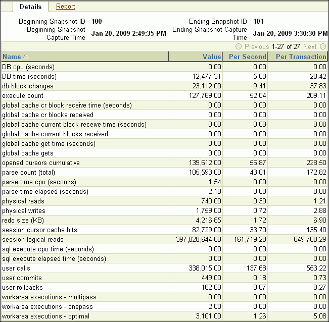 In this example, statistics gathered from the previous snapshot (snapshot 100) to the selected snapshot (snapshot 101) are displayed.