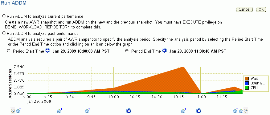 By default, ADDM runs every hour to analyze snapshots taken by AWR during this period. In some cases you may notice performance degradation that did not exist in the previous ADDM analysis period, or a sudden spike in database activity on the Performance page, as described in Chapter 4, "Monitoring Real-Time Database Performance". If the next ADDM analysis is not scheduled to run for 30 minutes, then you can run ADDM manually to identify and resolve the performance problem.