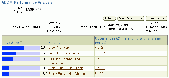 After ADDM completes the analysis, the Automatic Database Diagnostic Monitor (ADDM) page appears with the results of the ADDM run.
