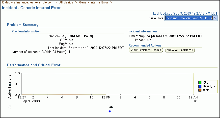 An Incident detail or Data Failure page appears for the type of incident you selected. For example, if you clicked a message about an ORA-600 error, then the Incident - Generic Internal Error page appears.