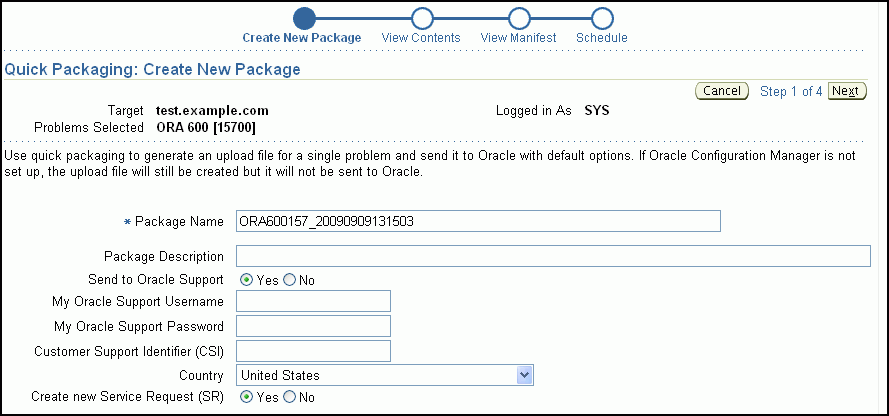 If you select the Yes option button for Create new Service Request (SR), then the Quick Packaging wizard creates a draft service request on your behalf. You must later log in to My Oracle Support and fill in the details of the service request.
