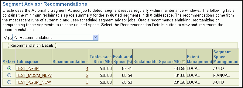 You can run the Segment Advisor manually. You do so when you want to analyze objects not selected for analysis by the Automatic Segment Advisor, or when you want more up-to-date recommendations on a tablespace.