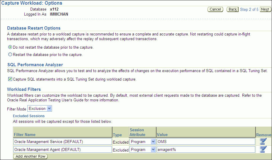 To add filters, click Add Another Row and enter the filter name, session attribute, and value in the corresponding fields. For more information, see "Using Filters with Workload Capture".