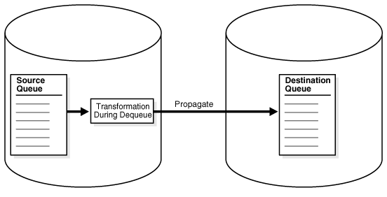 For example, suppose a message is propagated from the dbs1.example.com database to the dbs2.example.com database in its original form. When the messaging client dequeues the message at dbs2.example.com, the message is transformed.