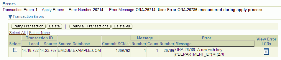 After you correct the problem that caused one or more error transactions, you can retry the error transactions or delete them. See "Retrying or Deleting Apply Error Transactions" for instructions.