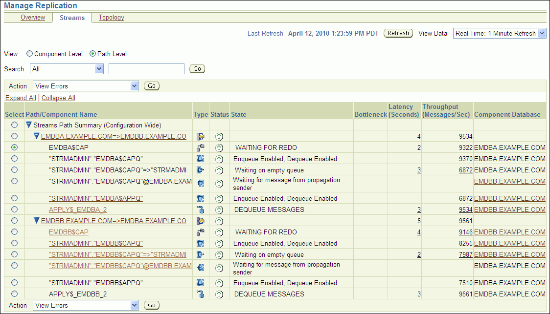 Oracle Enterprise Manager uses the Oracle Streams Performance Advisor to track the stream paths for the Oracle Streams components in a database. The Oracle Streams components include capture processes, queues, propagation senders, propagation receivers, and apply processes. The Oracle Streams Performance Advisor enables you to monitor these components are performing. The Oracle Streams Performance Advisor also tracks the links between the components, and the way information flows from capture to consumption.