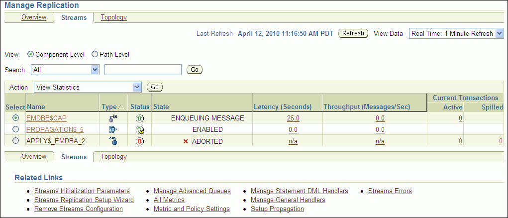 In Database Control, links are not available for statistics that are for components that run on a remote database.Oracle Enterprise Manager uses the Oracle Streams Performance Advisor to monitor the performance of the Oracle Streams components in a database.