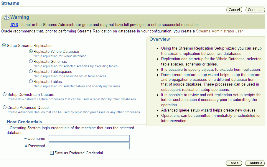 You can identify the current database or a different database in the Host Name, Port, and SID or Service Name fields. The Oracle Streams administrator is created on the database you identify in these fields.