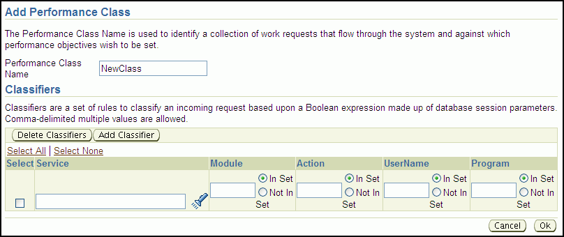 In the Classifiers section, enter information to define a rule for classifying work requests. First select a database service, then specify matching values (In Set) for the module, action, UserName, or program name that is associated with the work request using the specified database service. You can also specify exclusion values (Not In Set) for these attributes.